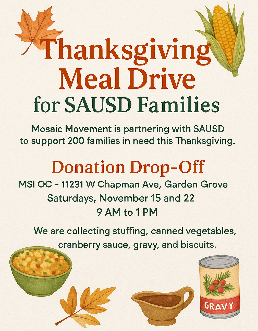 Mosaic Movement is collaborating with MSI OC Community Church to provide support to 2000 families in need during the Christmas season. The primary focus is on delivering essential meals to ensure every family has a complete holiday meal.