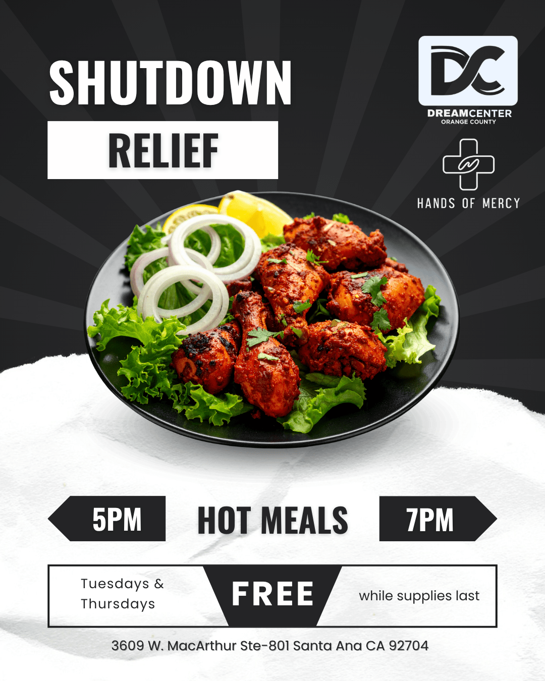 We are serving free, hot meals (while supplies last) to anyone affected by the shutdown or experiencing food hardship on Tuesdays and Thursdays from 5pm-7pm.