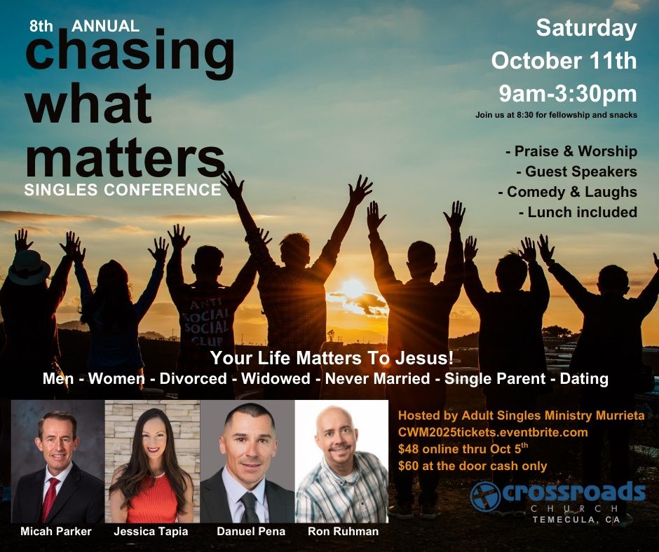 Join us at Crossroads Church Temecula for our 8th annual conference, Chasing What Matters. Your life matters to Jesus whether you are divorced, widowed, never married or a single parent. Enjoy music, comedy, mixer games, motivational speakers and lunch.